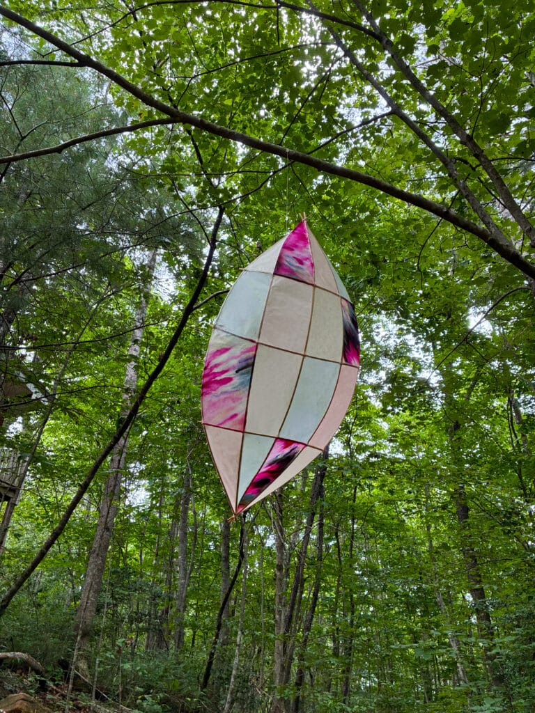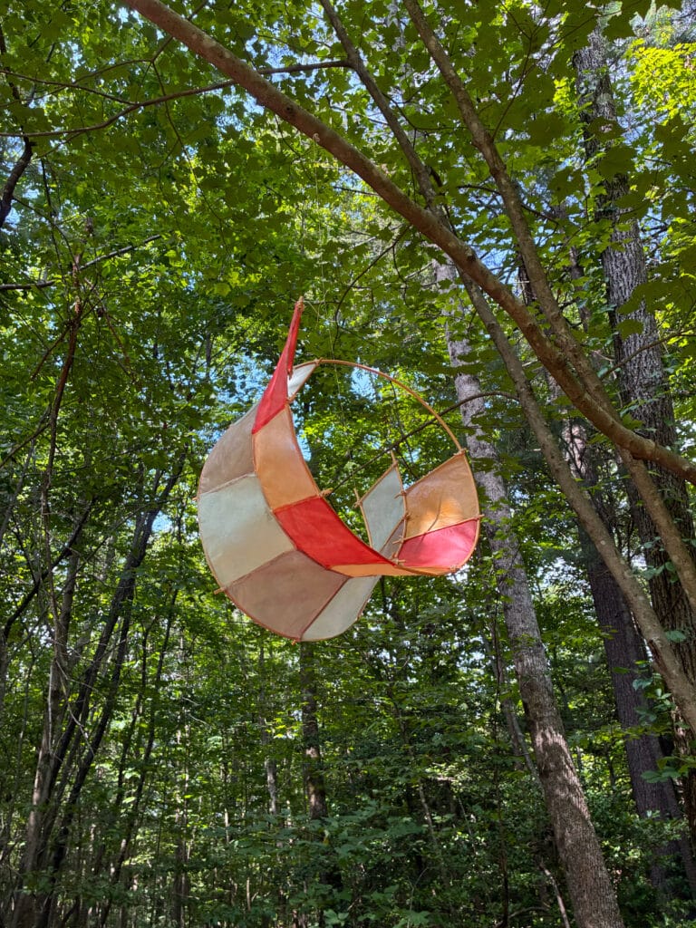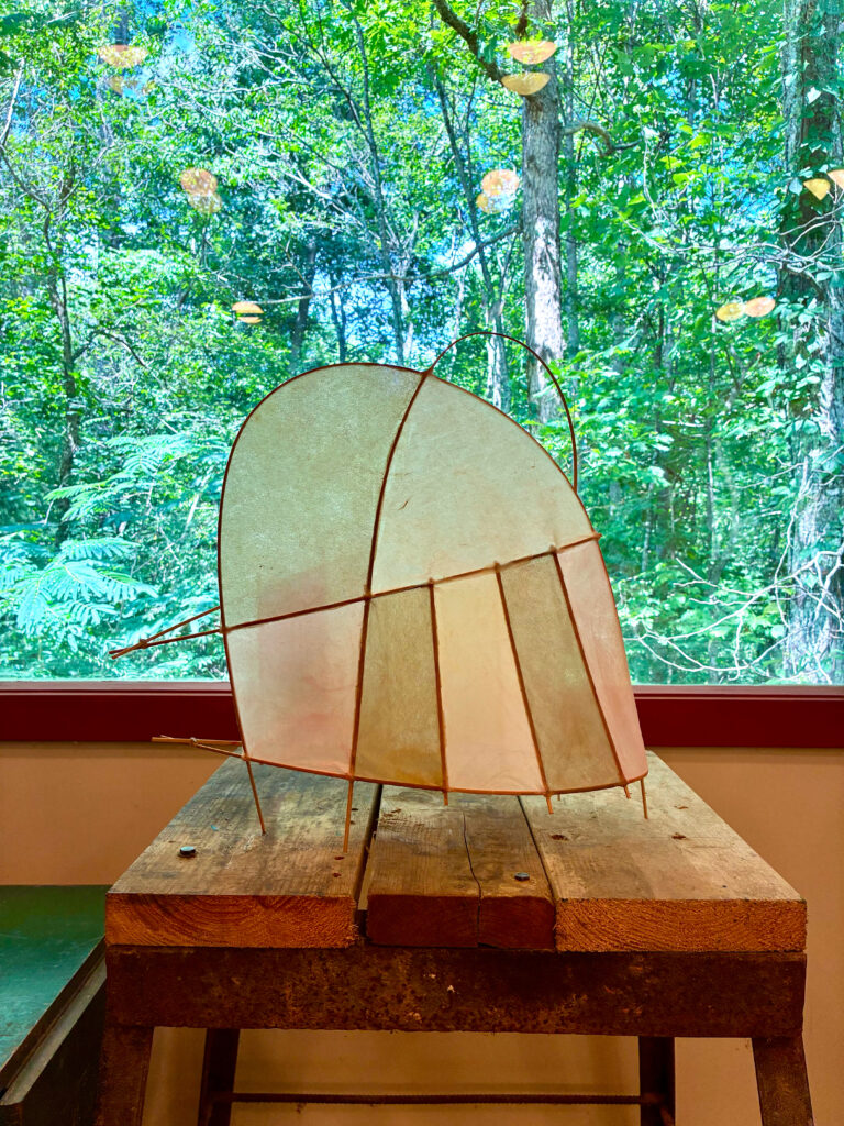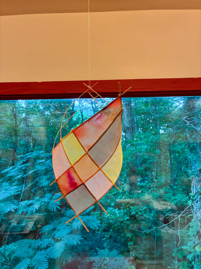 This collection is inspired by kites and is constructed with bamboo and hand dyed tengucho paper.